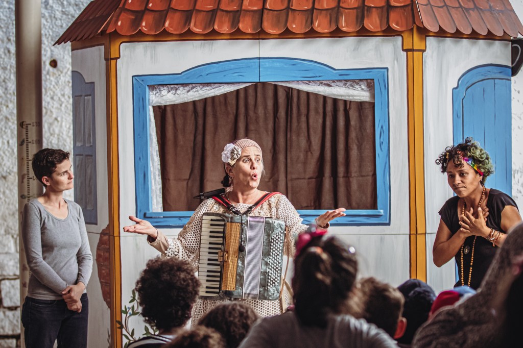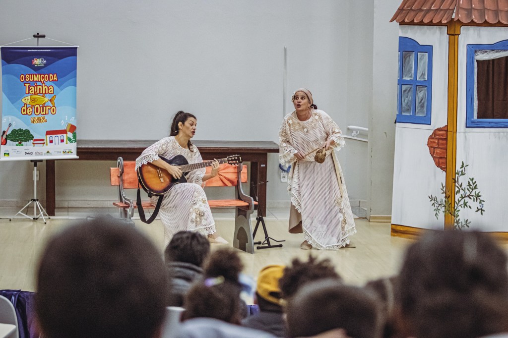 O sumiço da tainha de ouro – causos & contos, com direção de Aline Maciel, tendo em cena as atrizes-brincantes Bianca Ramos e Carina Scheibel, é um espetáculo brincante, com música ao vivo, muita história e causos e contos.